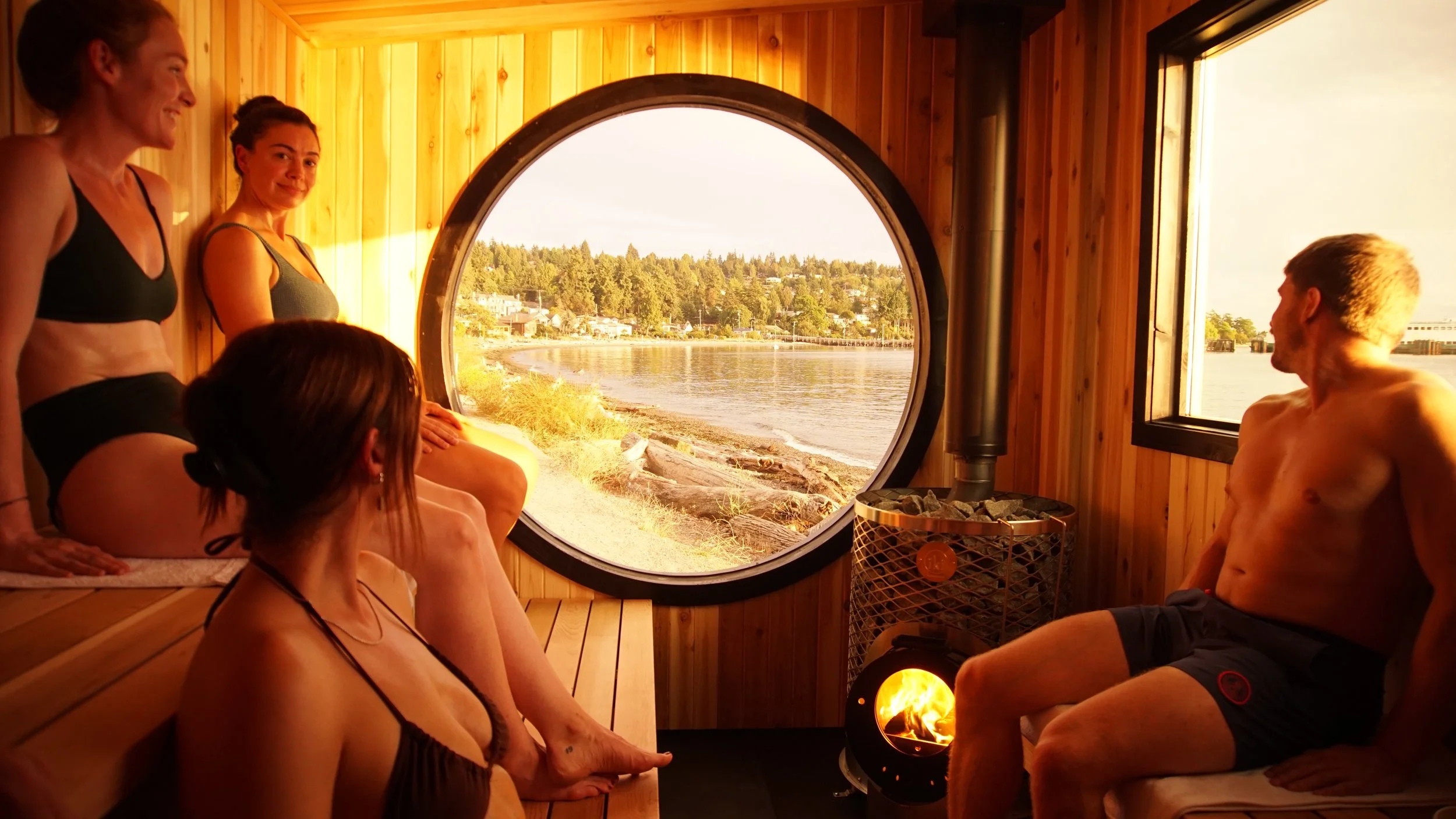 Book a session online, show up with a towel and your swimsuit, and step into our wood-fired cedar sauna. We’ll be preheated and ready to go. Sweat, steam, cool down, repeat. It’s communal, cozy, and parked near water for optional cold plunges. Simple as that.